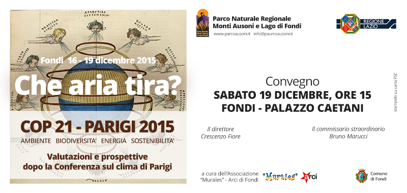 Sabato 19 dicembre 2015 alle ore 15:00  presso Palazzo Caetani a Fondi(LT) si terrà il convegno  "Che aria tira? - Valutazioni e prospettive dopo la Conferenza sul clima di Parigi”.