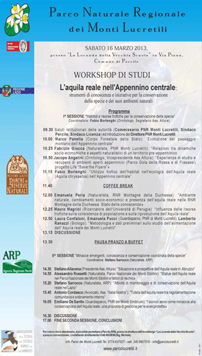 Sabato 16 marzo 2013 presso "La Locanda della Vecchia Scola", sita in loc. via Piana, nel Comune di Percile (RM) si svolgerà il workshop "L'aquila reale nell'Appennino centrale: strumenti di conoscenza ed iniziative per la conservazione della specie e dei suoi ambienti naturali"organizzato dall'Ente Parco Regionale Naturale dei Monti Lucretili, in collaborazione con l'Associazione Altura e l'Agenzia Regionale dei Parchi sull'aquila reale nell'Appennino centrale.