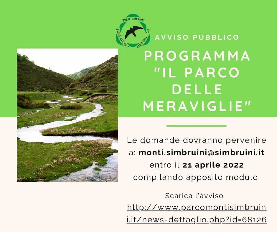 Il Parco dei Monti Simbruini intende riproporre, anche per l'anno 2022, il programma di promozione territoriale denominato "Il Parco delle meraviglie", finalizzato a favorire la conoscenza e la fruizione del territorio e il suo sviluppo sostenibile.
