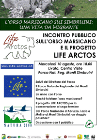 Il prossimo 10 agosto il WWF ha organizzato con la collaborazione della Regione Lazio e del Parco Regionale dei Monti Simbruini un incontro pubblico per presentare al pubblico il progetto "Life Arctos". L'incontro si terrà dalle ore 18.00 presso il centro visita di LIVATA. L'obiettivo dell'incontro è quello di illustrare le attività previste nel progetto LIFE, nonché chiarire l'importanza dell'area protetta per la conservazione a lungo termine della specie.