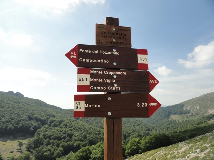 Punto di arrivo: Con un alternarsi di traversi e discese sostenute si perde altro importante dislivello, tant’è che raggiunta un’incisione valliva piuttosto evidente, dove scorre un torrente stagionale, il più della quota e della tappa sono state superate. Non che non manchino da superare ancora 3-4 chilometri, ma seguendo i segnavia l’arrivo a La Grancia, frazione di Morino, o prima, al campeggio e rifugio di Piano Sacramento, non sono ormai un anelito! Buon meritato riposo!