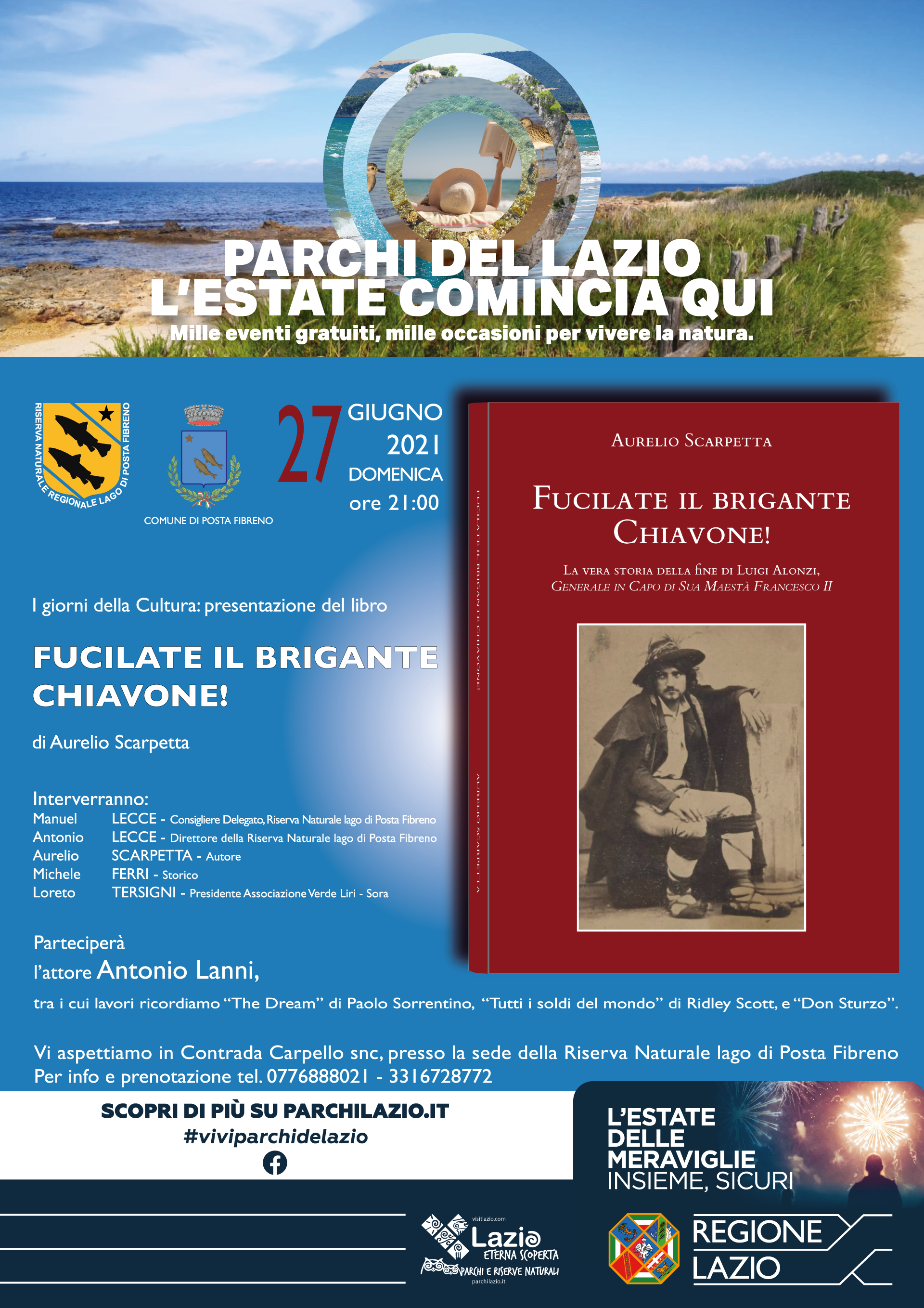 Domenica 27 giugno 2021 alle ore 21:00 presso la sede della Riserva, in contrada Carpello snc, con la presentazione del libro “FUCILATE IL BRIGANTE CHIAVONE!”  prosegue la rassegna dei giorni dedicati alla cultura dalla Riserva Naturale Lago di Posta Fibreno.