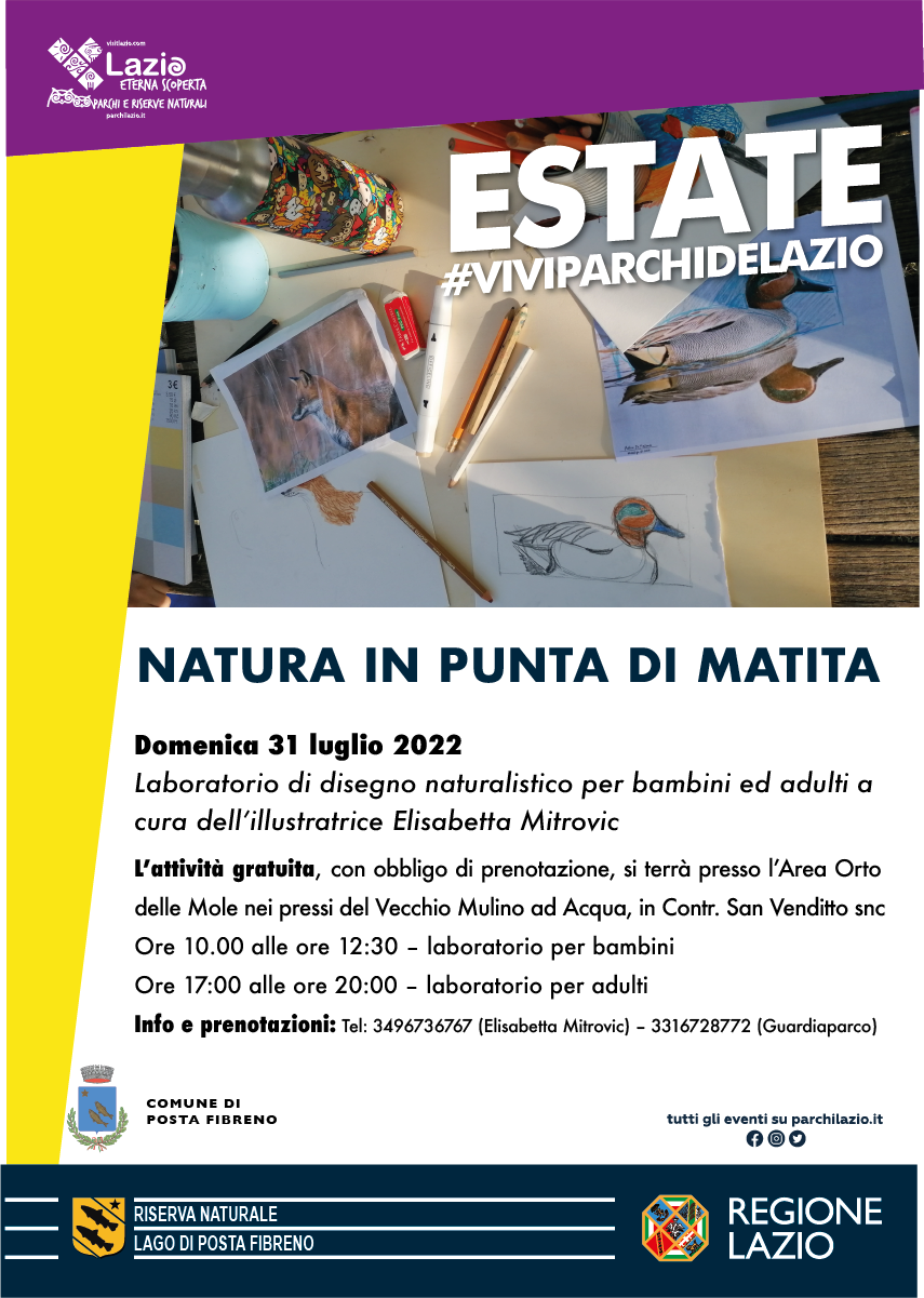 Elisabetta metterà a disposizione i suoi materiali per sperimentare insieme le tecniche di osservazione della fauna selvatica che frequenta il lago di Posta Fibreno, studiando a fondo le anatomie, i colori e i pattern che distinguono ogni specie. Ma anche per sperimentare le tecniche e i segreti del disegno naturalistico con matite, acquerelli, tempere e molto altro. Un modo nuovo e stimolante per scoprire la meravigliosa biodiversità della nostra Area protetta.
