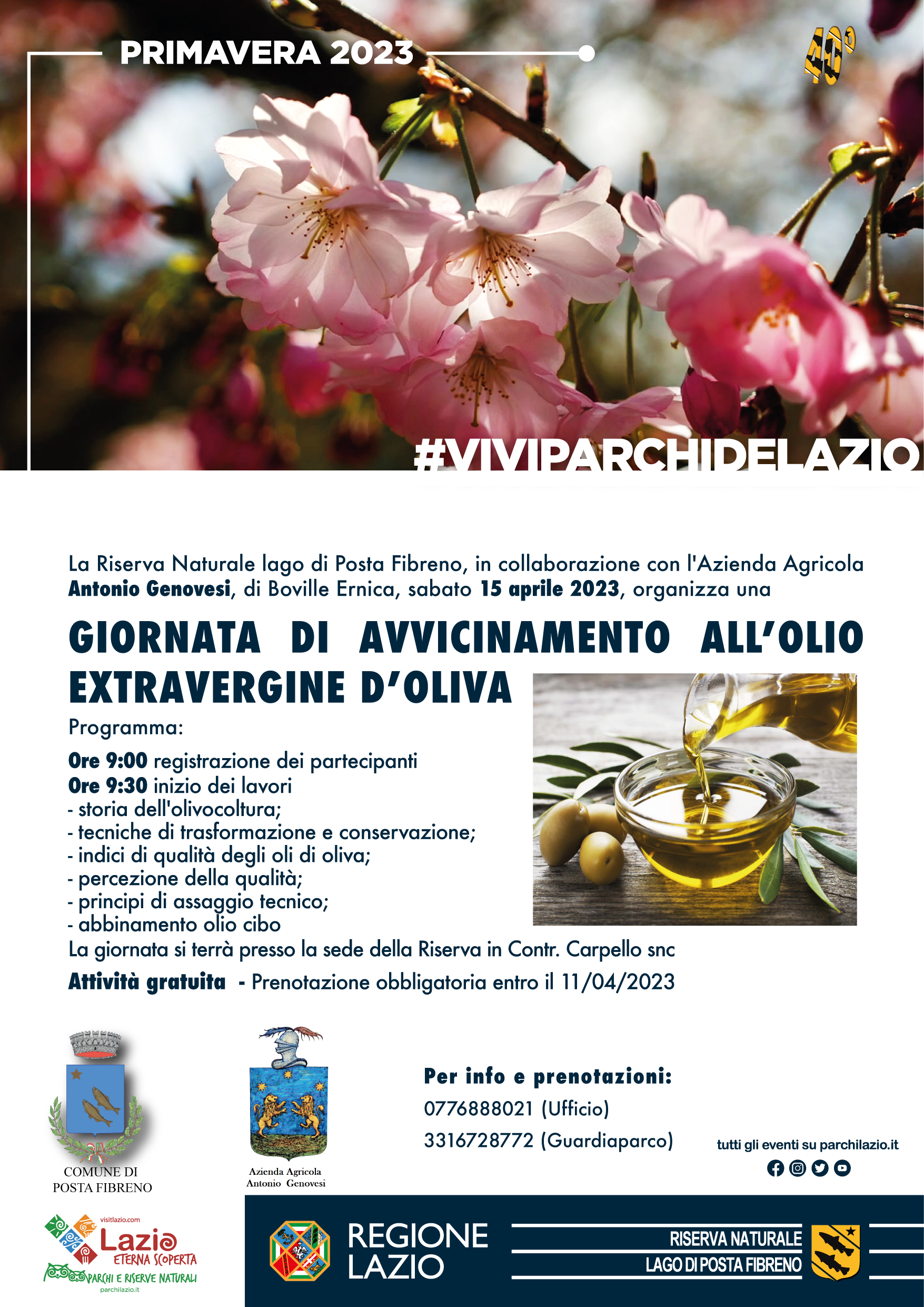 Sabato 15 aprile 2023, la Riserva Naturale lago di Posta Fibreno, in collaborazione con l’Azienda Agricola Genovesi, di Boville Ernica, organizza una giornata di avvicinamento all’olio extravergine di oliva.
