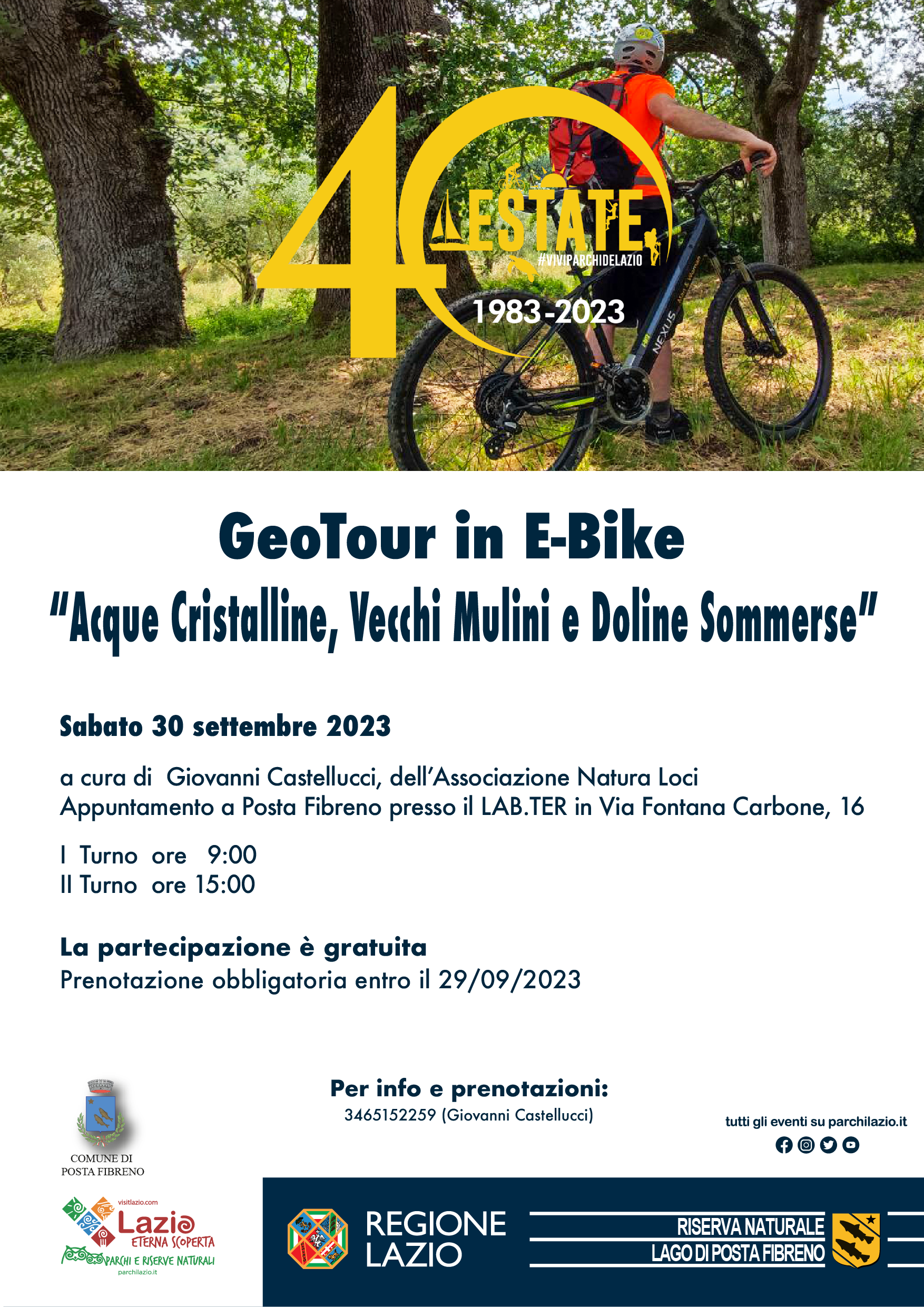 Sabato 30 settembre 2023, l’interessante GeoTour in E-Bike proposto permetterà ai partecipanti di effettuare una rilassante e panoramica pedalata nella Riserva Naturale lago di Posta Fibreno scoprendone il territorio e le sue peculiarità.