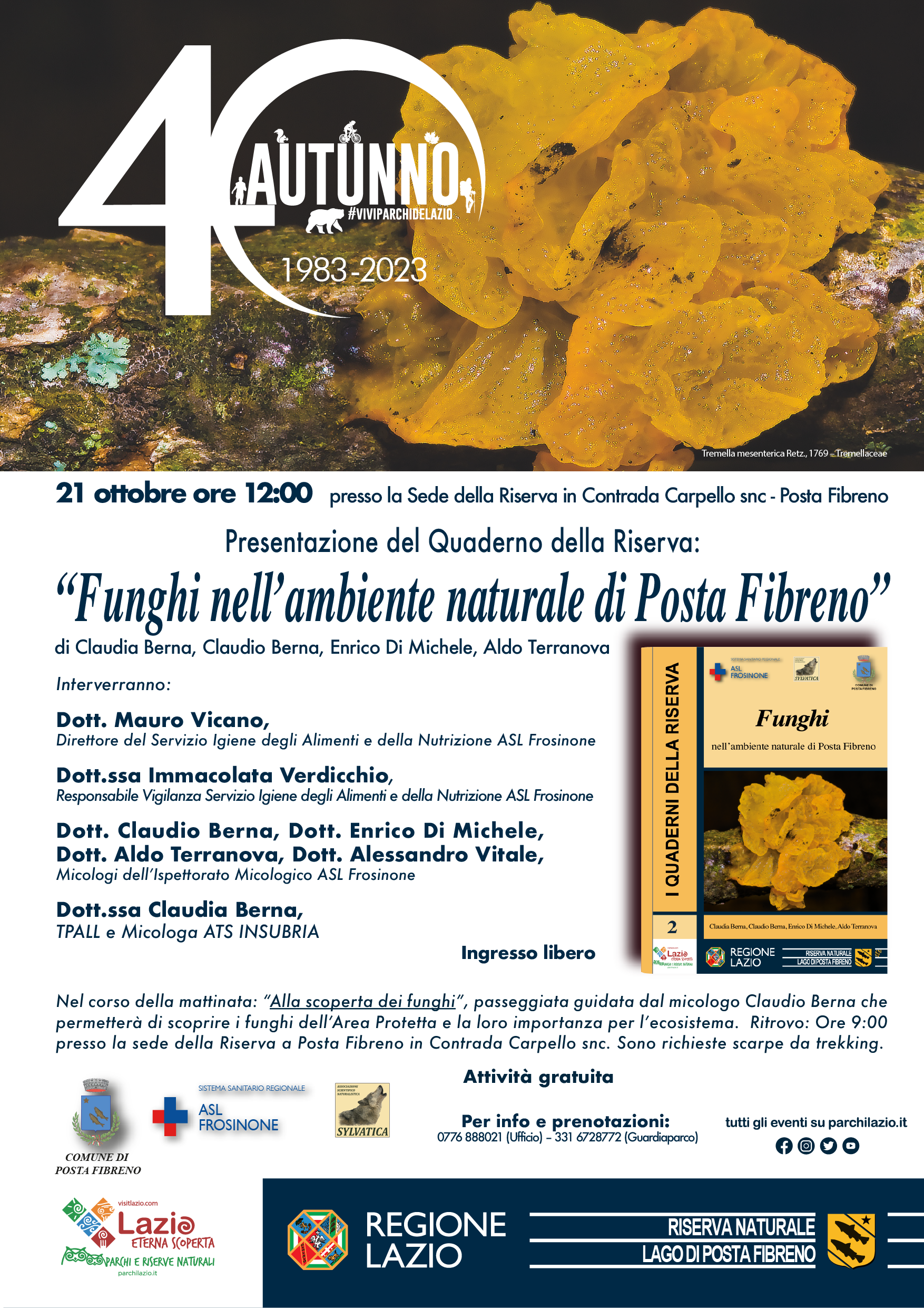 A seguire, alle ore 12:00, presso la sede della Riserva, la presentazione del Quaderno della Riserva “Funghi nell’ambiente naturale di Posta Fibreno”, scritto dai micologi: Claudia Berna, Claudio Berna, Enrico Di Michele, Aldo Terranova.