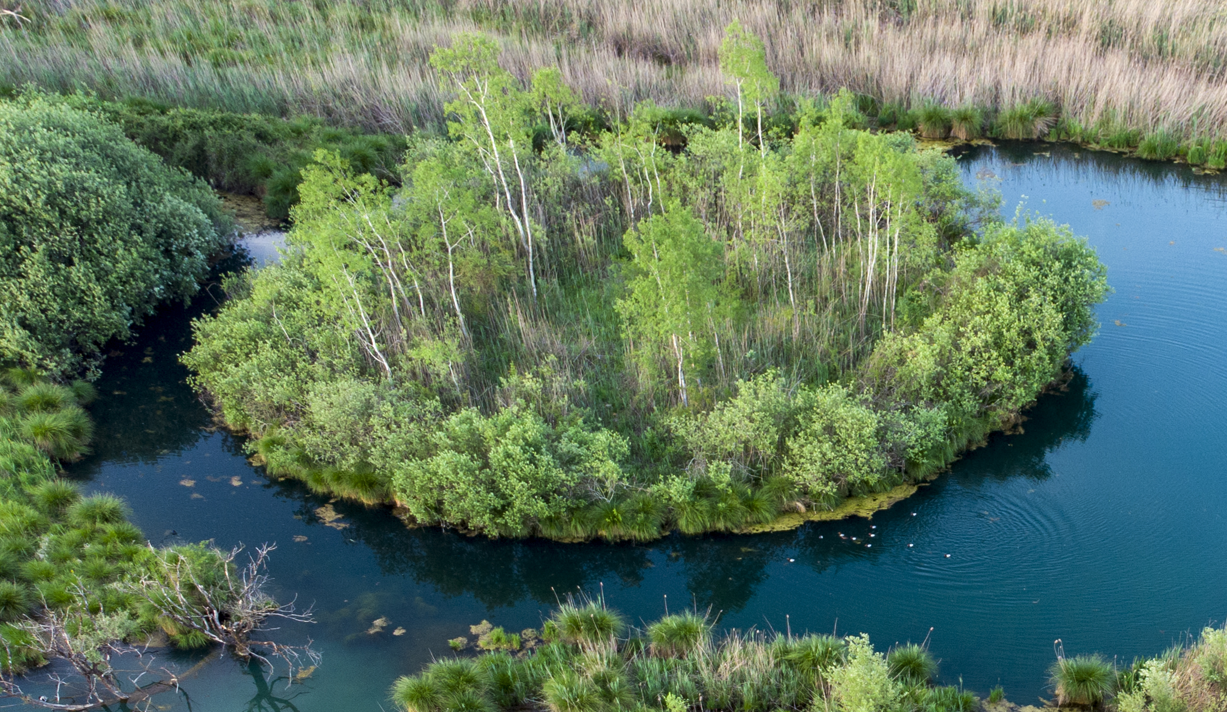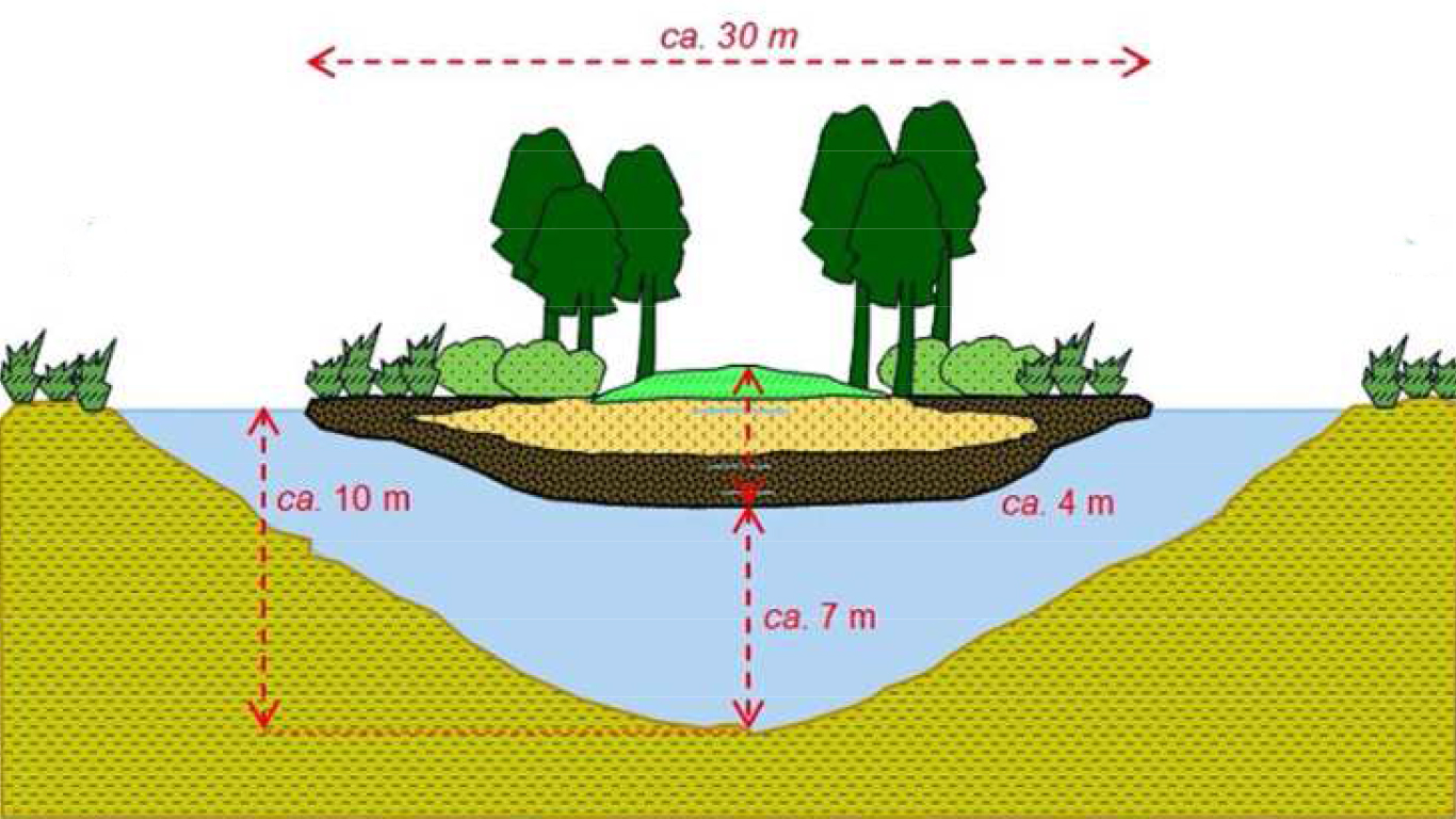 “L’isola galleggiante”, nella parte centrale ha uno spessore di circa quattro metri, si presenta come un cono con la punta rivolta verso il basso. Gli alberi presenti sull’isolotto hanno una crescita lenta rispetto a quelli piantati sulle rive in quanto, affondando le proprie radici in acqua da cui ne traggono poco nutrimento.