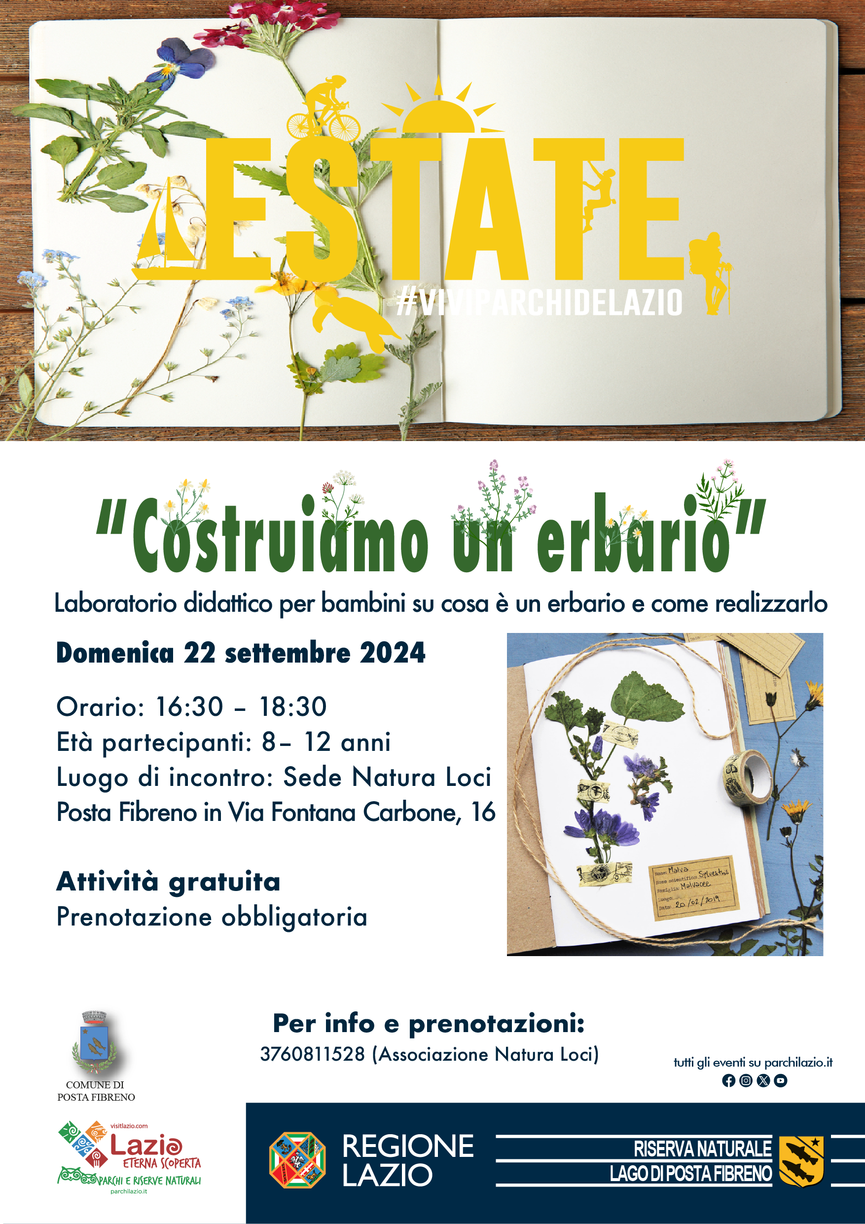 Domenica 22 settembre 2024 la Riserva Naturale lago di Posta Fibreno organizza “Costruiamo un erbario”, laboratorio per bambini da 8 a 12 anni per imparare, giocando, cos’è un erbario e come si realizza.