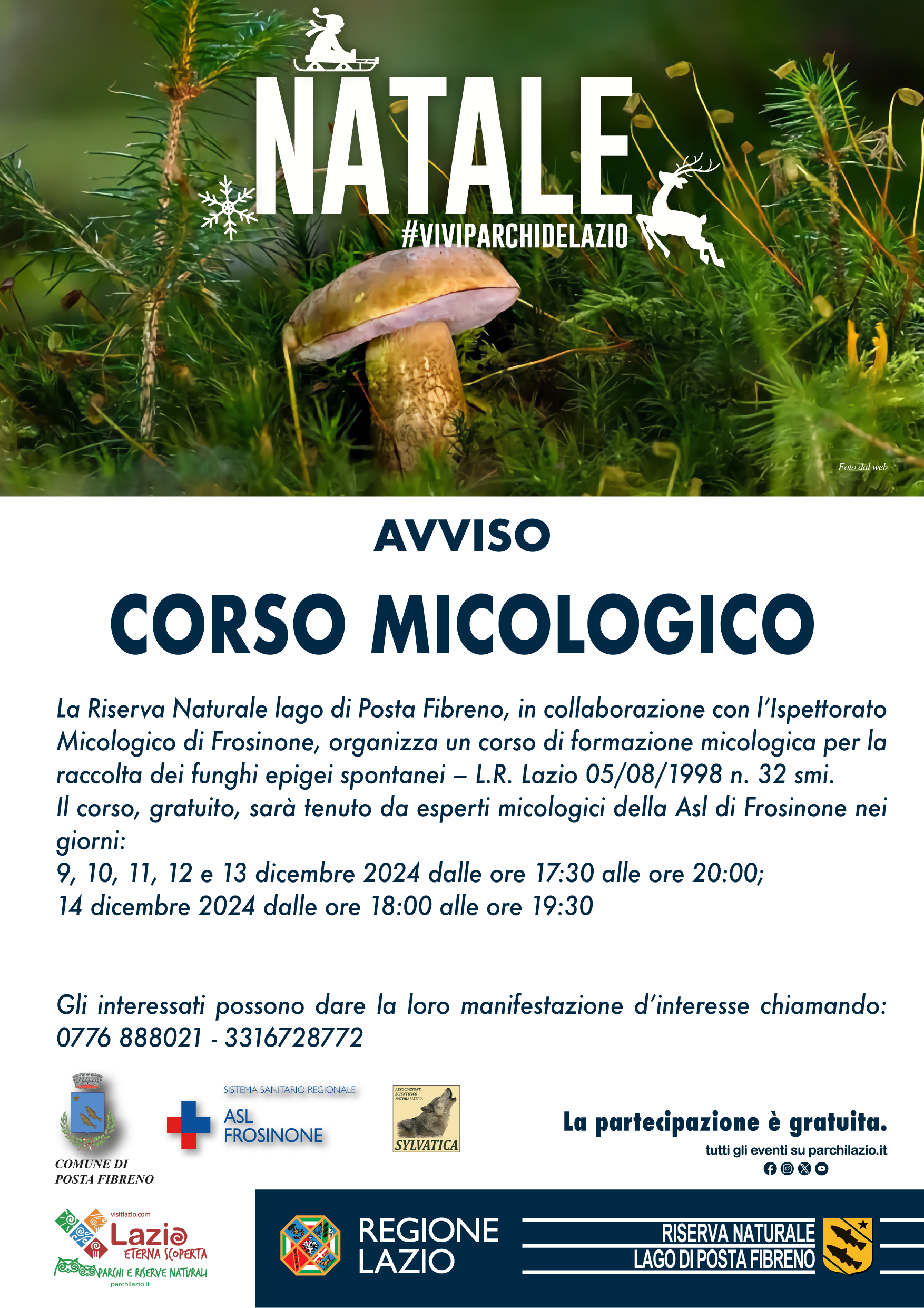 La Riserva Naturale Lago di Posta Fibreno, in collaborazione con l’Ispettorato Micologico di Frosinone sta organizzando, per il mese di dicembre 2024, un corso di formazione micologica, valido per ottenere l’attestato di frequenza richiesto per la raccolta dei funghi epigei spontanei nella Regione Lazio - L.R. Lazio 05/08/1998 n. 32.