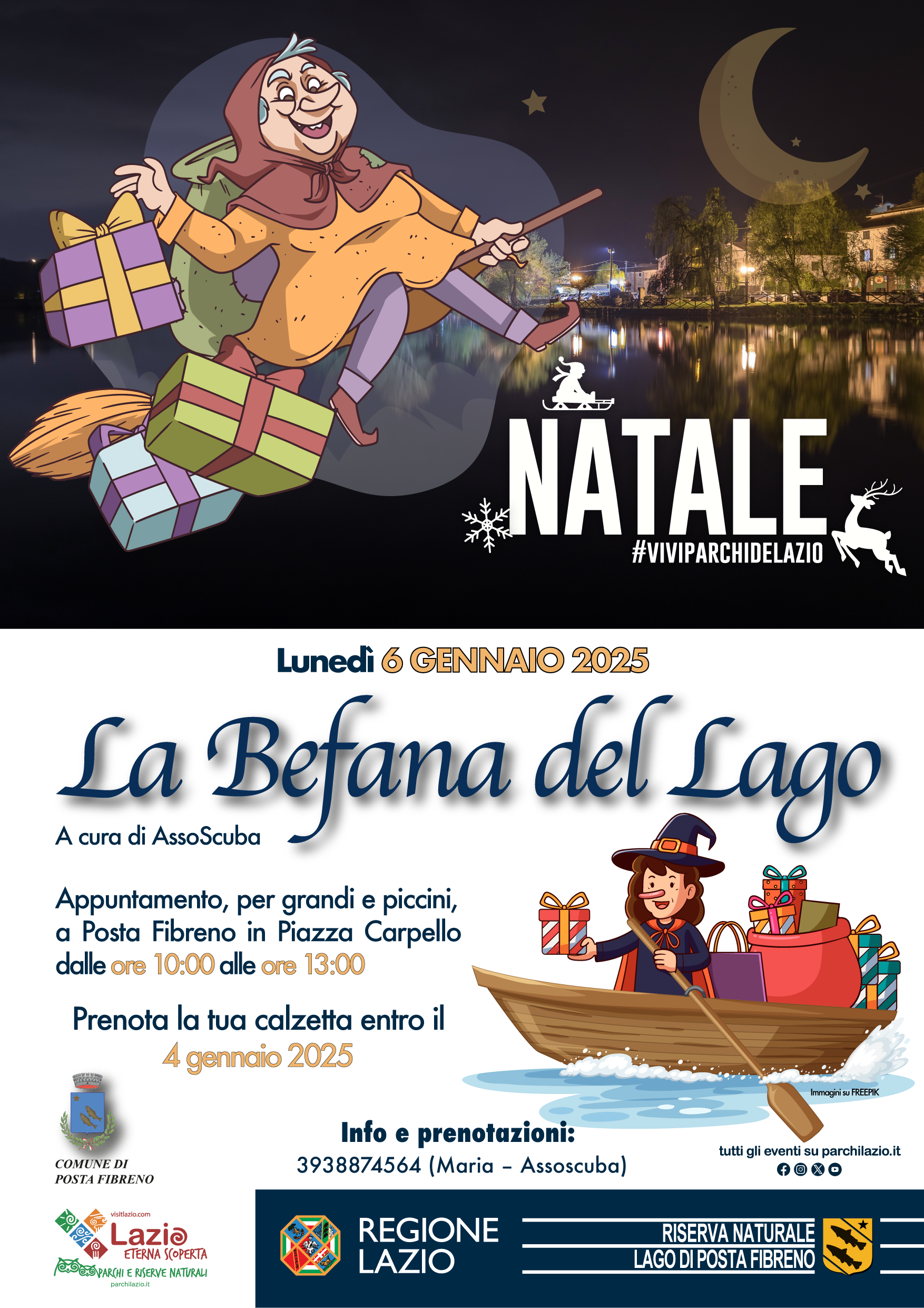 Organizzato dalla Riserva Naturale Lago di Posta Fibreno, l’evento, a cura di Assoscuba, vedrà la simpatica vecchietta immergersi nelle acque del lago per poi riemergere con un sacco pieno di calzette da donare ai piccoli partecipanti.