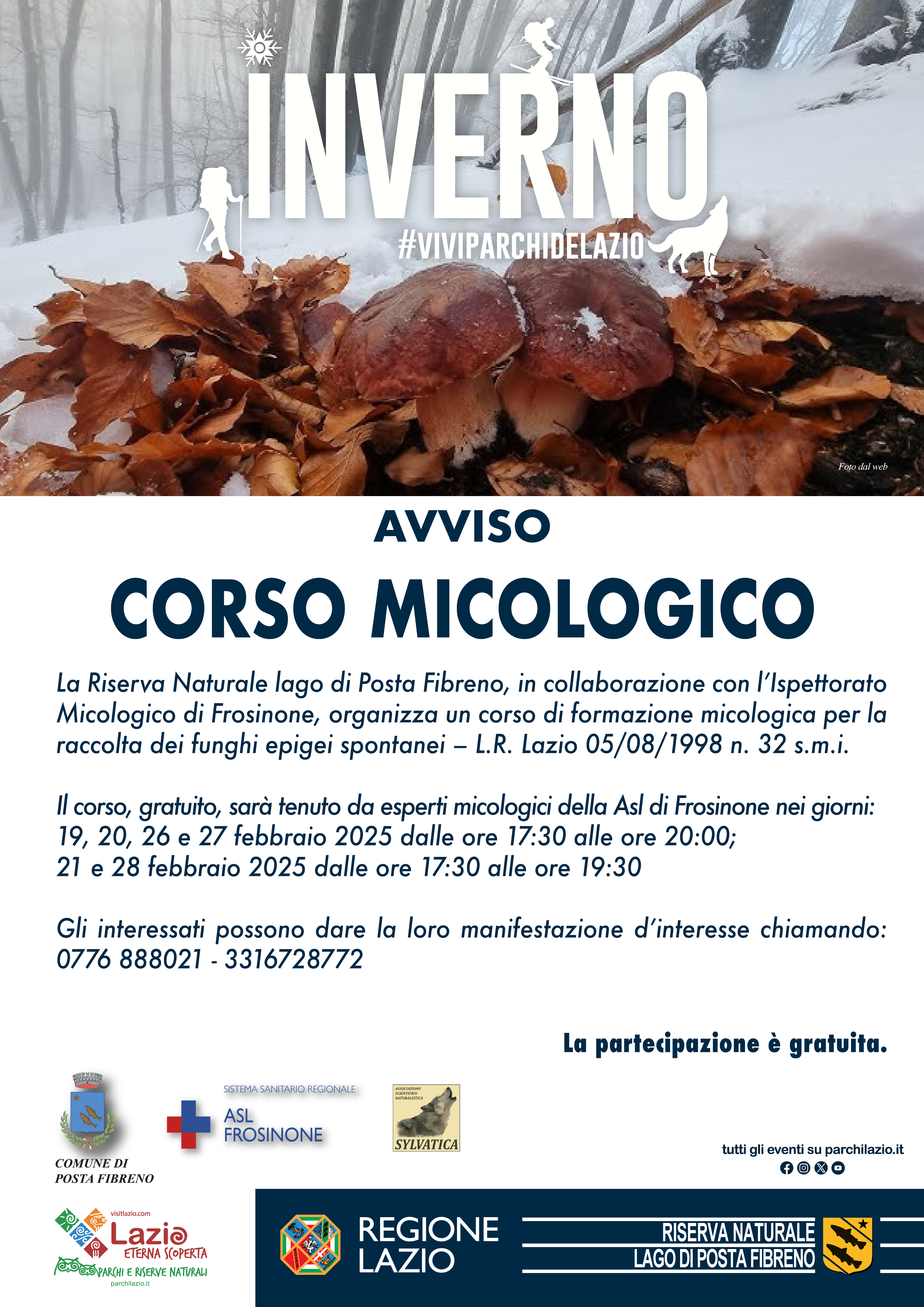 La Riserva Naturale Lago di Posta Fibreno, in collaborazione con l’Ispettorato Micologico di Frosinone sta organizzando, per il mese di febbraio 2025, un corso di formazione micologica, per la raccolta dei funghi epigei spontanei - L.R. Lazio 05/08/1998 n. 32 smc.