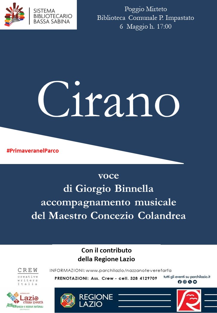 Con il contributo della Regione Lazio, il 06 maggio 2024 il nostro parco promuove un reading musicale dedicato al Cirano. Con letture di Giorgio Binnella e musica del maestro Concezio Colandrea. Presso la biblioteca Peppino Impastato di Poggio Mirteto. Vi aspettiamo.