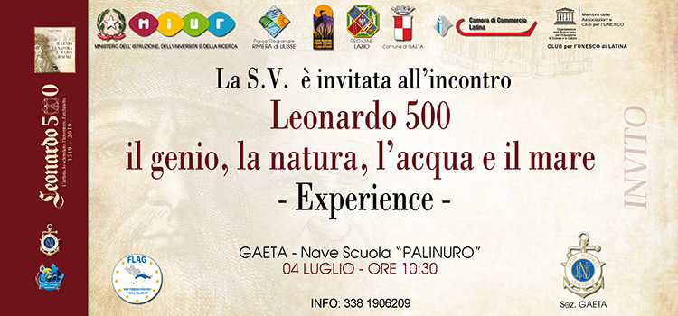 Giovedì 4 Luglio alle ore 10,30 a Gaeta, si terrà, sulla nave scuola Palinuro, un incontro nell'ambito del progetto "Leonardo - La natura, l'acqua e il mare" per trattare gli studi leonardiani sul tema delle acque, del mare, del moto ondoso.