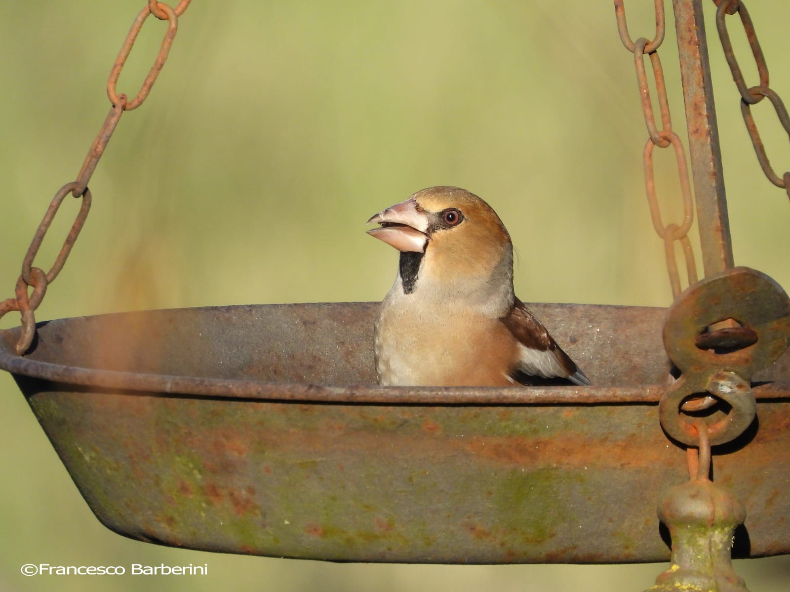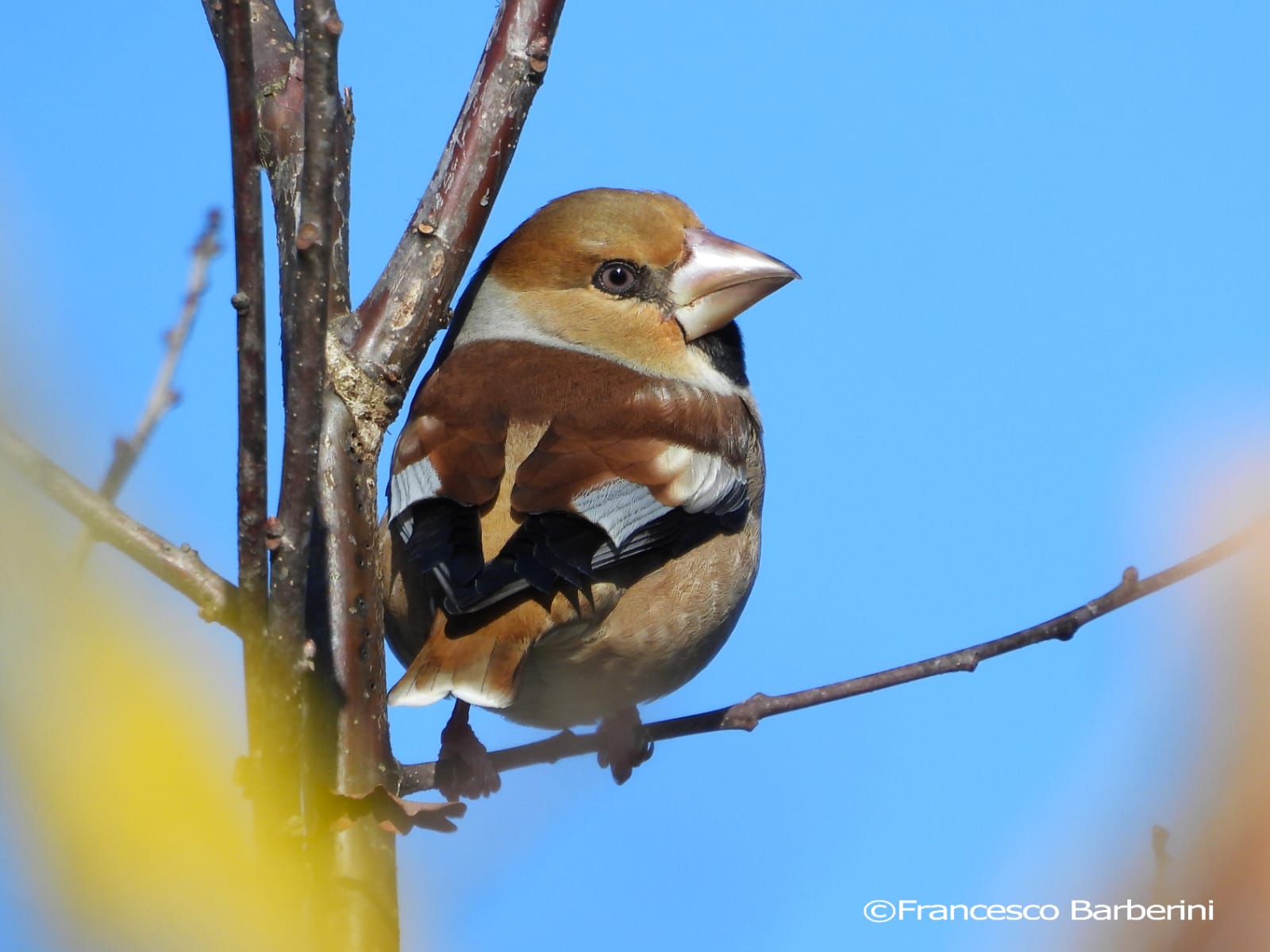 In un antico oliveto all’interno della Riserva di Monte Rufeno, in pieno inverno, mentre Fringuelli e Cince svolazzano in giro, si odono brevi colpi secchi, come se qualcosa si rompesse, dei quali è difficile capire l’origine. Dopo qualche minuto in silenziosa osservazione ecco che compare la risposta. Un piccolo assembramento di Frosoni è intento a cibarsi di uno dei semi più duri del nostro territorio: il nocciolo d’oliva. Il Frosone è un uccello non più grande di un Merlo, molto compatto, con una coda corta, ma soprattutto dotato di un tozzo, enorme e potente becco. Le sue mascelle possono serrarsi fino a sprigionare una forza pari a 50 kg sulla punta del becco, capace di rompere semi molto resistenti di cui non riescono a cibarsi altre specie affini, come Fringuelli e Verdoni. Si tratta dell’animale che rispetto alle sue dimensioni corporee, ha il morso più potente di tutti. Perciò è meglio non provarlo con le proprie mani! Anche il suo nome scientifico lo ricorda, Coccothraustes infatti significa: “rompi semi”.