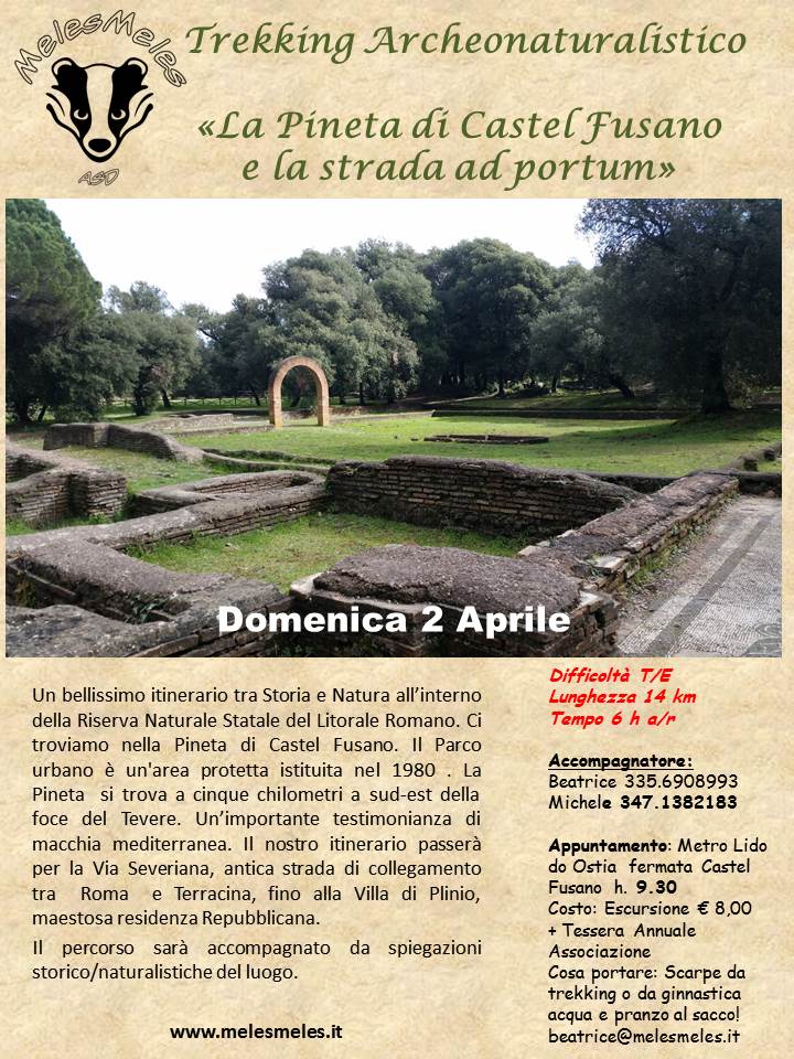 Un bellissimo itinerario tra Storia e Natura all’interno della Riserva Naturale Statale del Litorale Romano a cura dell'Associazione Meles Meles. Ci troviamo nella Pineta di Castel Fusano. Il Parco urbano è un'area protetta istituita nel 1980 . La Pineta si trova a cinque chilometri a sud-est della foce del Tevere. Un’importante testimonianza di macchia mediterranea. Il nostro itinerario passerà per la via Severiana, antica strada di collegamento tra Roma e Terracina, fino alla Villa di Plinio, maestosa residenza Repubblicana. Il percorso sarà accompagnato da spiegazioni storico/naturalistiche del luogo. Attività adatta a tutti anche ai bambini.