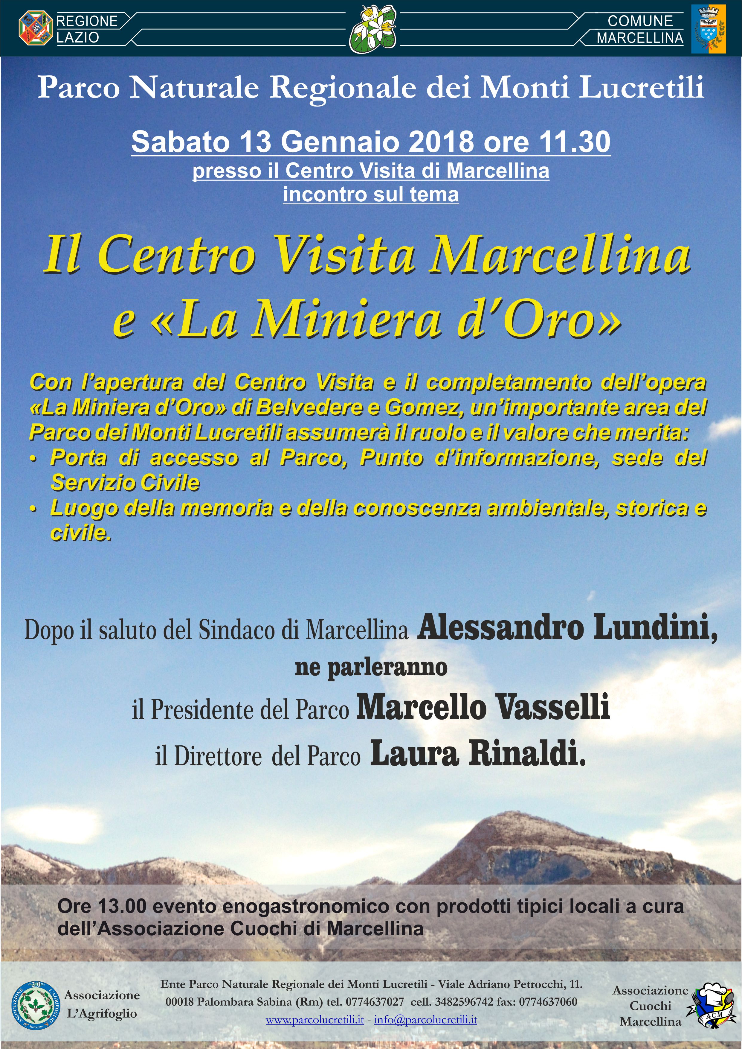 All’incontro sul tema “Centro Visita di Marcellina e la Miniera d’Oro” che si terrà il 13 gennaio 2018, alle ore 11,30 presso il Centro visita .di Marcellina, saranno presenti: Alessandro Lundini, Sindaco di Marcellina; Marcello Vasselli, Presidente del Parco dei Monti Lucretili e Laura Rinaldi Direttore del Parco dei Monti Lucretili.