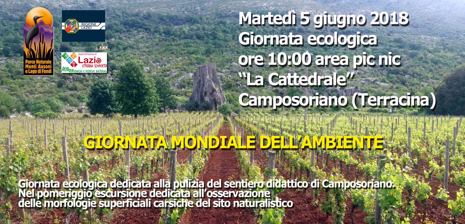 Martedì 5 giugno 2018. In occasione della Giornata Mondiale dell’Ambiente, quest’anno dedicata a combattere l’utilizzo della plastica mono-uso, l’Ente Parco Naturale Regionale Monti Ausoni e Lago di Fondi organizza una giornata ecologica dedicata alla pulizia del sentiero didattico di Camposoriano (Terracina).