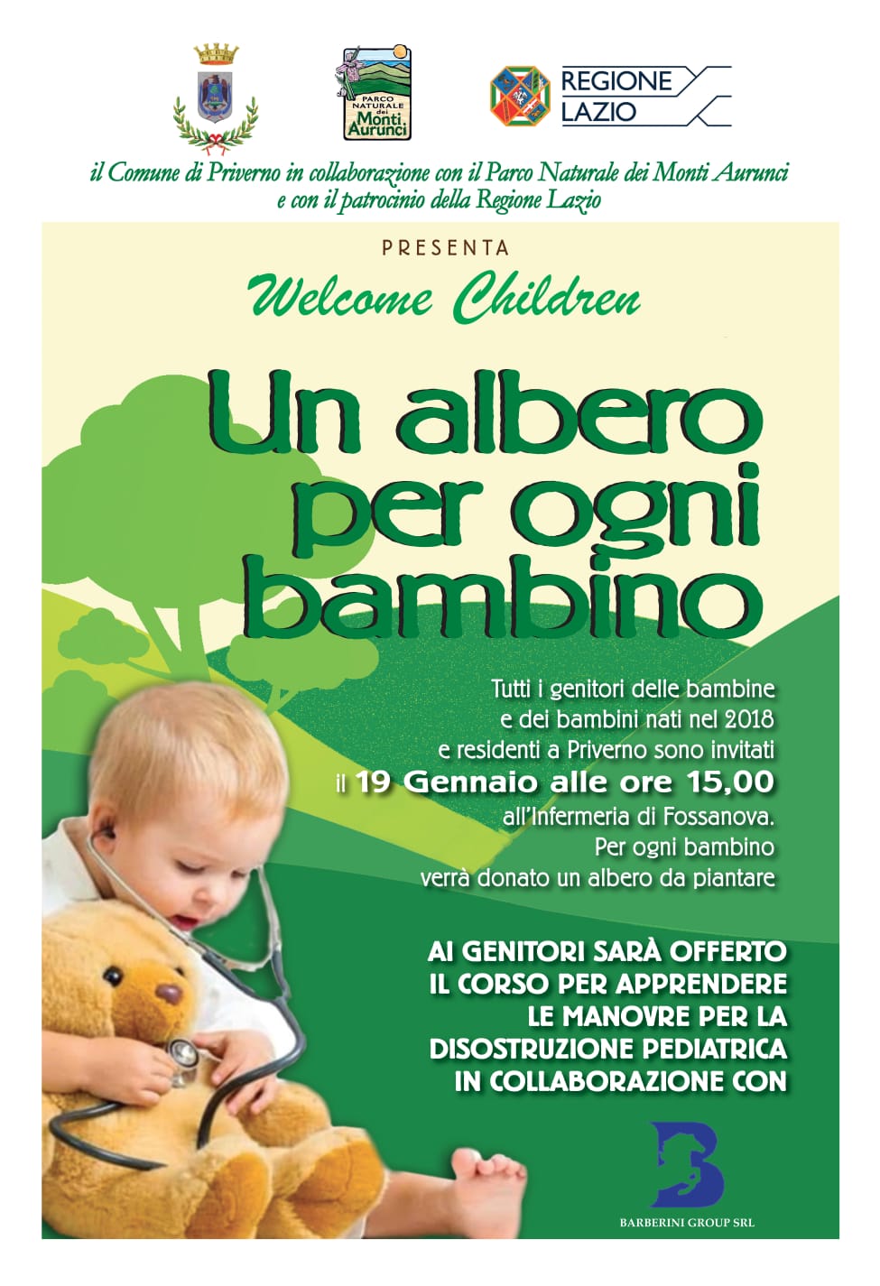 Il Comune di Priverno, in collaborazione con il Parco dei Monti Aurunci e con il patrocinio della Regione Lazio Presenta: Welcom Children. Un Albero per ogni bambino. Gli alberi, donati dal Parco dei Monti Aurunci, saranno consegnati sabato 19 gennaio alle ore 15 all’Infermeria di Fossanova. Nell'occasione sarà sottoscritta una convenzione tra il Presidente del Parco Marco Delle Cese e il sindaco di Priverno Annamaria Bilancia. Ai genitori sarà offerto il corso per apprendere le manovre per la disostruzione pediatrica in collaborazione con Barberini Group.