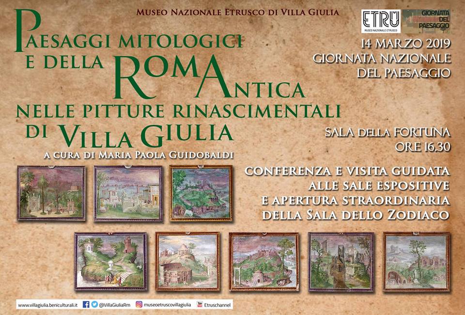 I visitatori saranno accolti da una conferenza dedicata alla riscoperta dei paesaggi mitologici e della Roma antica che fanno parte della decorazione pittorica di Villa Giulia, la villa rinascimentale di Papa Giulio III. La Villa stessa era immersa in un contesto ambientale e paesaggistico molto diverso da quello attuale e nel quale percorsi architettonici e naturalistici si rincorrono e si integrano.