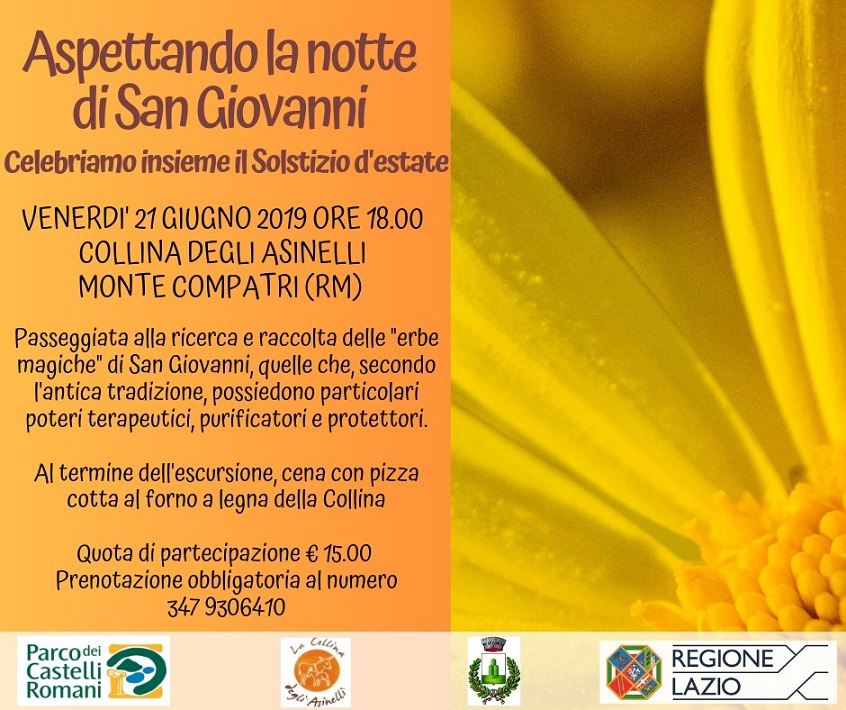 Vi aspettiamo venerdì 21 giugno alle ore 18.00, presso la Collina degli Asinelli - via San Silvestro, Monte Compatri (RM) - per passeggiare insieme alla ricerca e raccolta delle "erbe magiche" di San Giovanni, quelle che, secondo l'antica tradizione, possiedono particolari poteri terapeutici, purificatori e protettori.