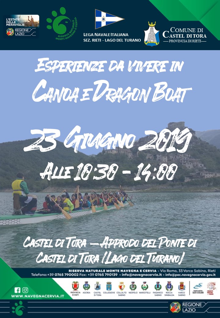 La Riserva Naturale Monti Navegna e Cervia e la Lega Navale Italiana Sez. Rieti - Lago del Turano, invitano tutti i cittadini a partecipare all'evento in programma domenica 23 Giugno dalle 10:30 alle 14:00 per provare le discipline legate al lago, in particolare la Canoa, il Kayak e le Dragon Boat.