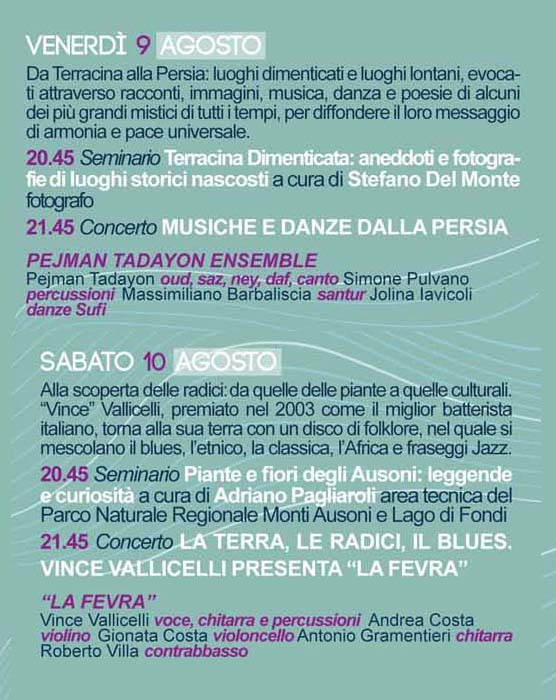 Sempre Venerdì 9 agosto 2019, da Terracina alla Persia: luoghi dimenticati e luoghi lontani, evocati attraverso racconti, immagini, musica, danza e poesie di alcuni dei più grandi mistici di tutti i tempi, per diffondere il loro messaggio di armonia e pace universale come è tradizione delle confraternite sufi.