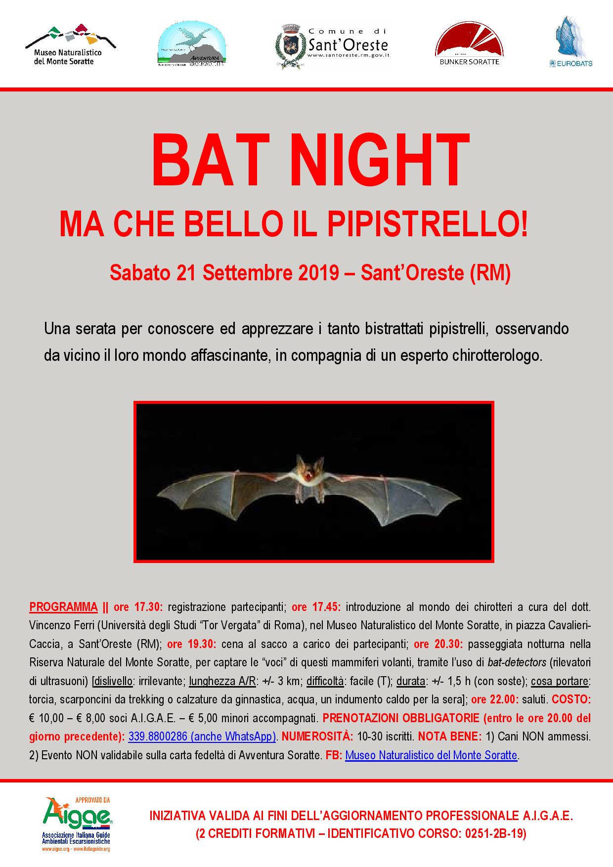 ore 17,45: introduzione al mondo dei chirotteri a cura del dott. Vincenzo Ferri (Università degli Studi “Tor Vergata” di Roma), nel Museo Naturalistico del Monte Soratte, in piazza Cavalieri - Caccia, a Sant’Oreste (RM);