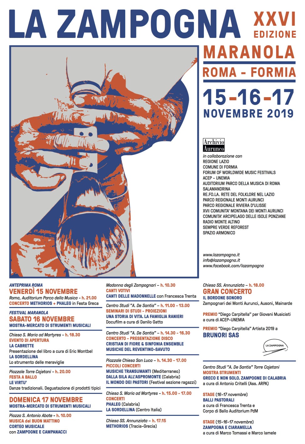 Il taglio del nastro a Maranola sarà sabato 16 con la mostra mercato di strumenti musicali. Sempre sabato nella Santa Maria ad Martyres ci sarà l’evento di apertura con la presentazione del libro La Cabrette di Eric Montbel e La Sordellina, lo strumento della meraviglie. Domenica ci saranno una serie di eventi a partire dalle ore 10 con il Corteo delle Zampogna e Campanacci.