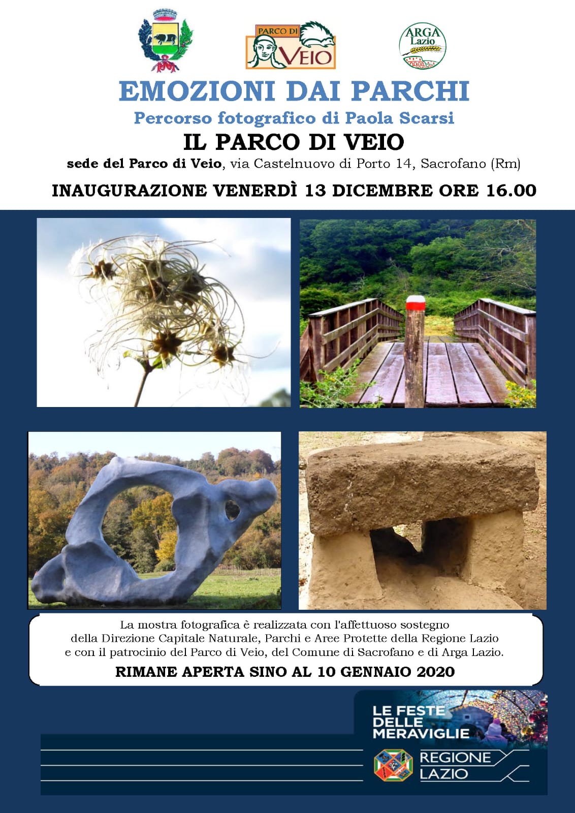 Con la mostra nella sede del Parco di Veio prosegue il progetto fotografico "Emozioni dai parchi" che ha preso il via con la mostra nel Museo Civico Etrusco Romano di Trevignano Romano, seguita da una nella sede del Parco del Treja a Calcata, poi nella sede dei Carabinieri ex Corpo Forestale dello Stato a Roma, in Castello Odescalchi a Bracciano in occasione dell'evento "1999-2019: venti anni del Parco Naturale di Bracciano e Martignano".