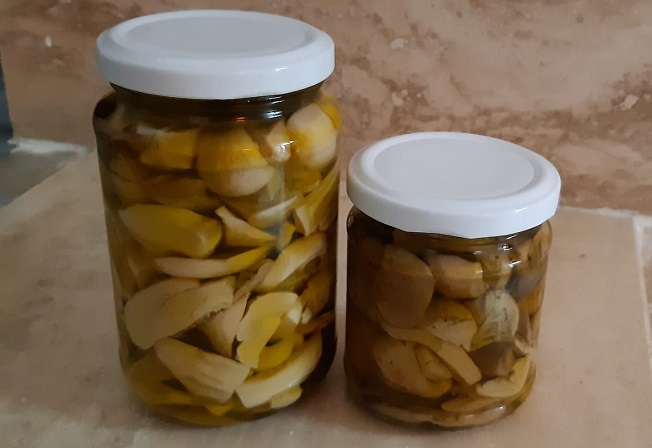 I funghi vengono poi scolati, fatti asciugare su di un canovaccio e messi nei vasetti sterilizzati alternando strati di funghi e strati di allora e pepe in grani. Chiudere i vasetti ermeticamente.