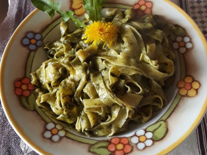 Cuocere le fettuccine al-dente e saltare in padella insieme al tarassaco, amalgamare il tutto con un mestolo di acqua di cottura della pasta.