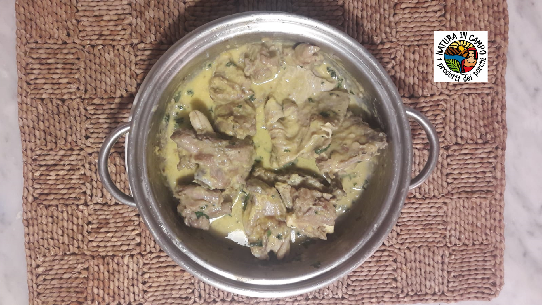 Battere il grasso del guanciale o del prosciutto con l’aglio e il prezzemolo e la maggiorana, metterlo in un tegame con l’olio e dopo averlo soffritto, aggiungervi l’abbacchio in pezzi. Far rosolare per qualche minuto con l’aggiunta di sale e sfumare poi con un bicchiere di vini bianco e se necessario, con l’aggiunta di un bicchiere di acqua calda, continuando a girare la carne fino a cottura ultimata. In una scodella sbattere i tuorli d’uovo con il sale, il pepe, il parmigiano, il prezzemolo tritato e per ultimo, il succo di limone. Versare il composto ottenuto sullo spezzatino appena ritirato dal fuoco, facendolo amalgamare per bene finché non abbia consistenza cremosa.