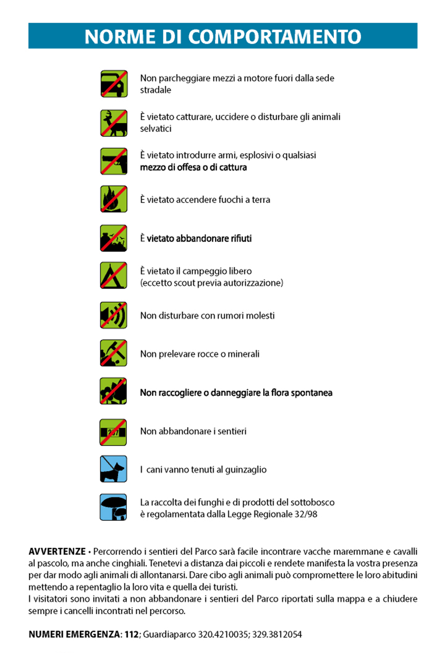 Si avvisano tutti i visitatori ed escursionisti che è necessario osservare alcune regole basilari per la tutela dell’ambiente, delle proprietà private e per la sicurezza personale, oltre a quelle che potete vedere in allegato.