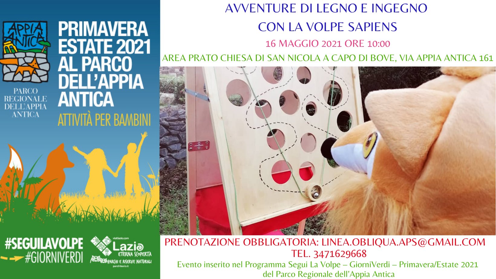 Insieme alla Volpe del Parco, che per l’occasione diventa “sapiens”, i bambini potranno imparare giocando. Attraverso l’utilizzo di giochi di legno anche in formato XXL, piccoli e grandi conosceranno le caratteristiche naturalistiche del parco e della vita degli antichi romani.