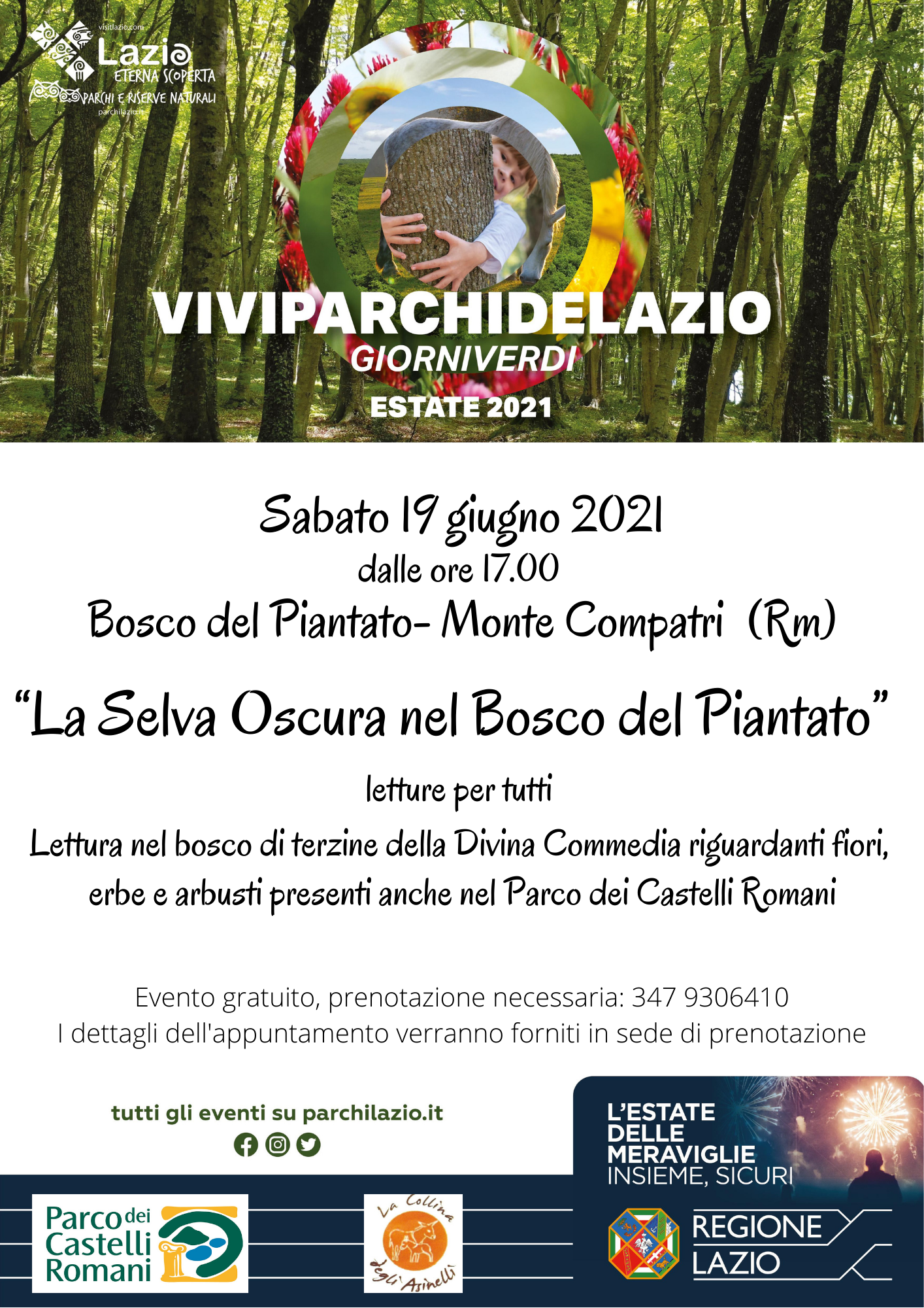 L'evento si svolgerà all'interno della "Macchia del Piantato", una delle rare zone dei Castelli Romani, dove sono presenti residui del bosco misto originario del territorio. L'iniziativa prevede la lettura di terzine della Divina Commedia riguardanti fiori, erbe e arbusti presenti nel nostro Parco, e si inserisce nella programmazione di eventi dedicati al settecentenario della morte del sommo poeta Dante Alighieri, che fanno parte della manifestazione della Regione Lazio: "A "A Riveder le Stelle".