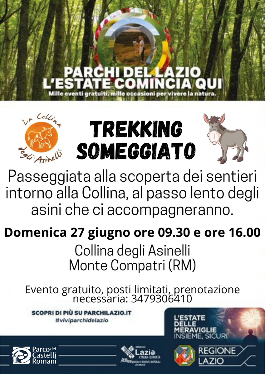 Domenica 27 giugno alle 09.30 e alle 16.00 “Trekking someggiato con gli asinelli” – passeggiata alla scoperta dei sentieri intorno alla Collina, al passo lento degli asini che ci accompagneranno. Collina degli Asinelli, Monte Compatri. Attività per tutti, gratuita, prenotazione necessaria: Lucia 3479306410