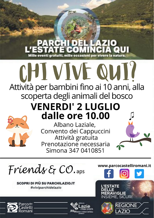 Venerdì 2 luglio dalle ore 10.00 “Chi vive qui?” - Attività per bambini fino ai 10 anni, alla scoperta degli animali del bosco. Albano Laziale, Convento dei Cappuccini, Friends & CO aps. Attività gratuita, prenotazione necessaria: Simona 347 0410851