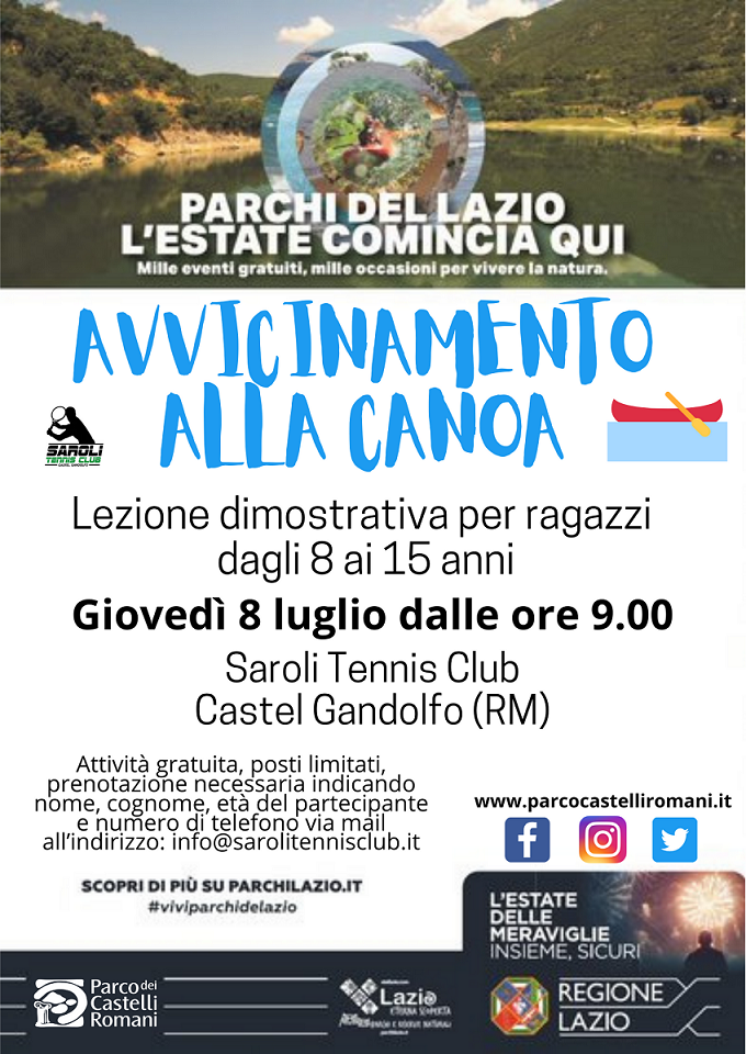 Giovedì 8 luglio dalle 9.00 alle 12.00 “Avvicinamento alla canoa” - Lezione per ragazzi dagli 8 ai 15 anni. Saroli Tennis Club, Castel Gandolfo. Attività gratuita, posti limitati, prenotazione necessaria indicando nome, cognome, età del partecipante e numero di telefono via mail all’indirizzo: info@sarolitennisclub.it