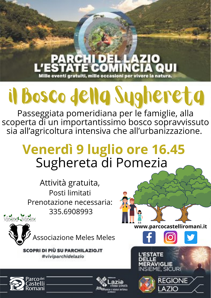 Venerdì 9 luglio ore 16.45 “Il Bosco della Sughereta” Passeggiata pomeridiana per le famiglie, alla scoperta di un importantissimo bosco sopravvissuto sia all’agricoltura intensiva che all’urbanizzazione. Sughereta di Pomezia, Associazione Meles Meles. Attività gratuita, posti limitati, prenotazione necessaria: 335.6908993