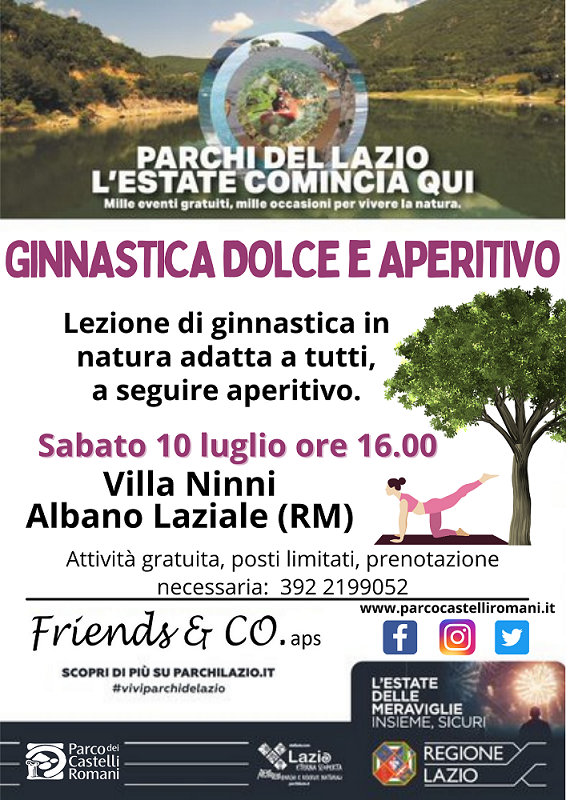 Sabato 10 luglio ore 16.00 “Ginnastica dolce e aperitivo”. Attività per tutti. Friends & CO aps. Villa Ninni, via Miralago, 1 – Albano Laziale. Attività per tutti, gratuita, prenotazione necessaria: Fabrizio 392 2199052