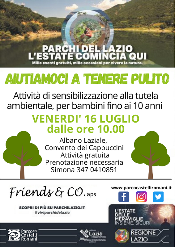 Venerdì 16 luglio ore 10.00 “Aiutiamoci a tenere pulito”. Attività per bambini fino a 10 anni, di sensibilizzazione alla tutela ambientale. Albano Laziale, Convento dei Cappuccini, Friends & CO aps. Attività gratuita, prenotazione necessaria: Simona 347 0410851