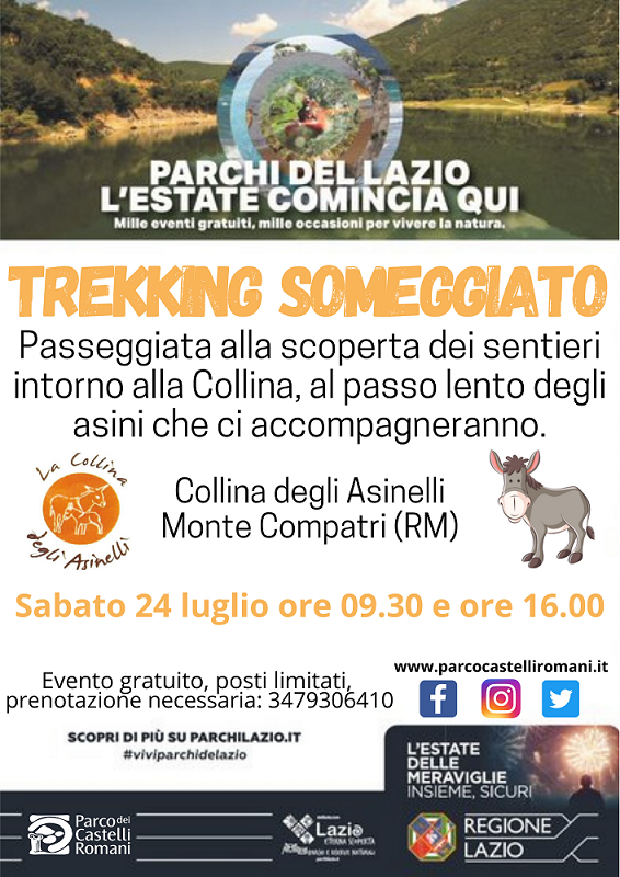 Sabato 24 luglio alle 09.30 e alle 16.00 “Trekking someggiato con gli asinelli” – passeggiata alla scoperta dei sentieri intorno alla Collina, al passo lento degli asini che ci accompagneranno. Collina degli Asinelli, Monte Compatri. Attività per tutti, gratuita, prenotazione necessaria: Lucia 3479306410