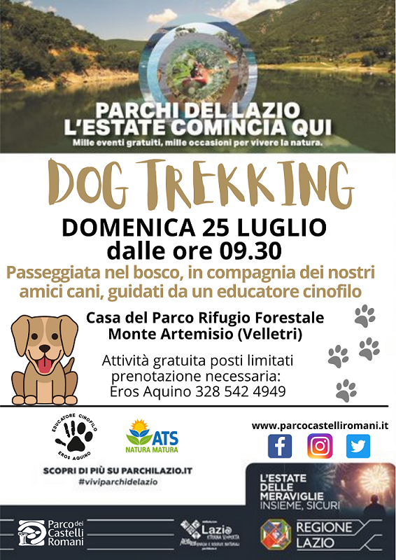 Domenica 25 luglio dalle 09.30 “Dog Trekking” - Un educatore cinofilo sarà disponibile per tutta questa giornata dedicata ai nostri amici cani per rispondere a domande e per guidarvi in una splendida passeggiata nel bosco - Centro Cinofilo Velletri, attività gratuita posti limitati, prenotazione necessaria: 328 542 4949