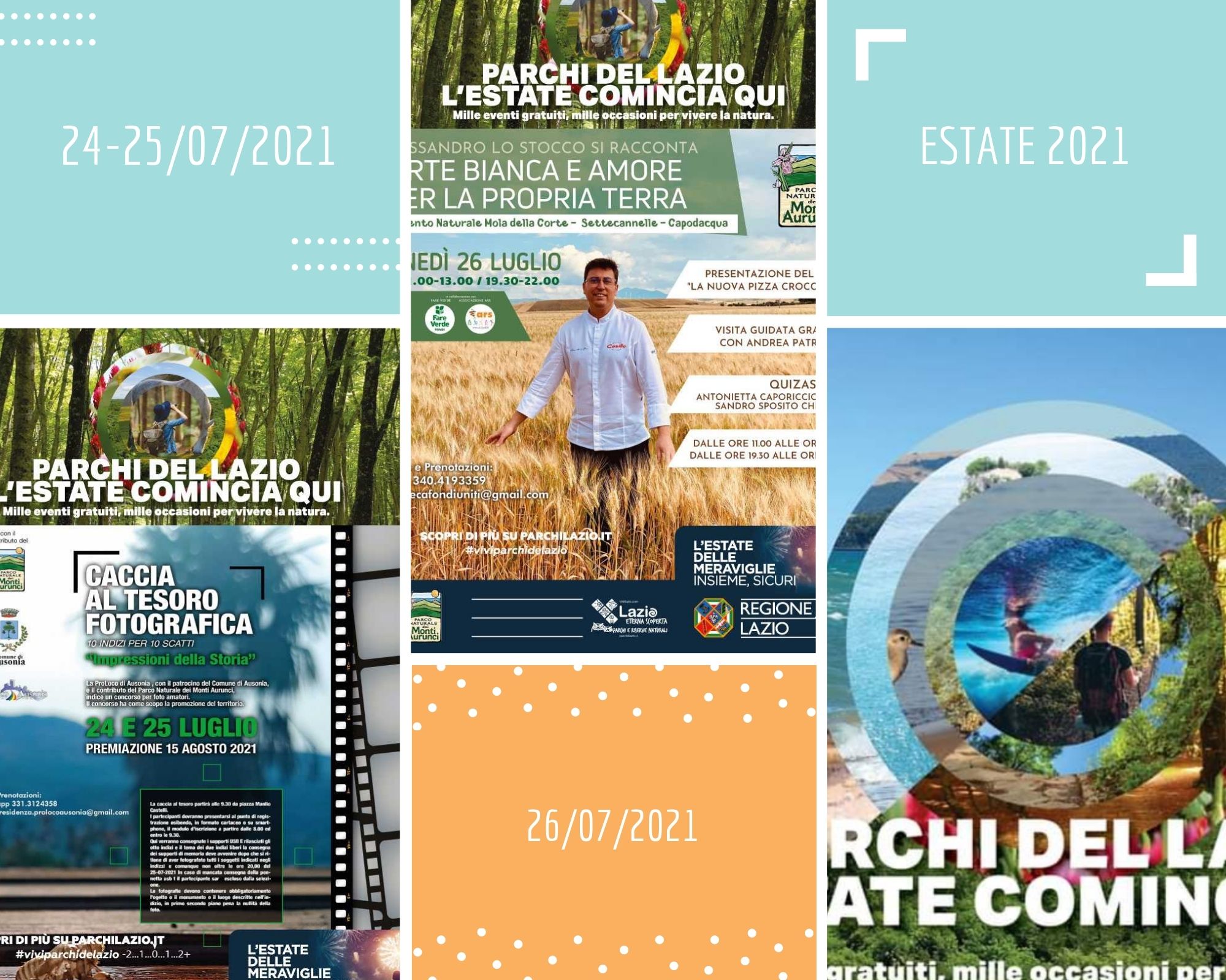 sabato 24 e domenica 25 luglio: "Impressioni della Storia" Concorso fotografico: caccia al tesoro fotografica sul territorio, monumenti, luoghi e realtà paesaggistica orario: 8:00 - comune di Ausonia e territorio limitrofo Info e Prenotazione al n° 331 3124358 Referente Vittorio Piccolino