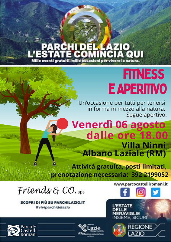 Venerdì 6 agosto dalle 18.00 “Fitness e apertivo” - Un’occasione per tenersi insieme in forma, in mezzo alla natura. Segue apertivo. Friends & CO aps. Villa Ninni, via Miralago, 1 - Albano Laziale. Attività per tutti, gratuita, prenotazione necessaria: Fabrizio 392 2199052