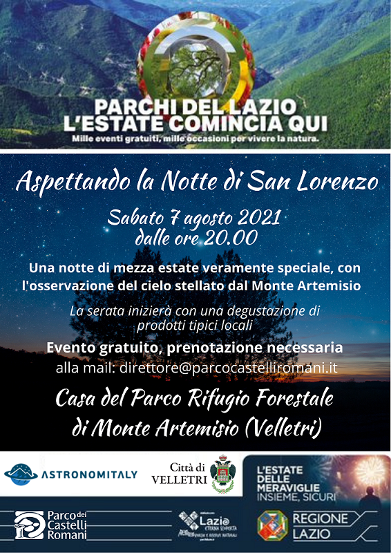 Sabato 7 agosto ore 20.00 “Aspettando la Notte si San Lorenzo” - Osservazione del cielo stellato dalla Casa del Parco Rifugio del Monte Artemisio , guidati da Astronomitaly. La serata inizierà con una degustazione di prodotti tipici locali. Attività per tutti, gratuita, prenotazione necessaria scrivendo una mail a: direttore@parcocastelliromani.it, con nome, cognome e numero dei partecipanti