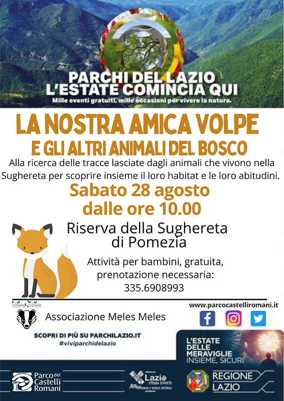 Sabato 28 agosto dalle 10.00 “La nostra amica Volpe e gli altri animali del bosco” - Alla ricerca delle tracce lasciate dagli animali che vivono nel parco per scoprire insieme il loro habitat e le loro abitudini. Riserva della Sughereta.