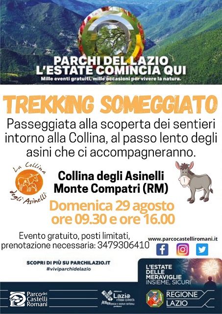 Domenica 29 agosto alle 09.30 e alle 16.00 “Trekking someggiato con gli asinelli” – passeggiata alla scoperta dei sentieri intorno alla Collina, al passo lento degli asini che ci accompagneranno. Collina degli Asinelli, Monte Compatri. Attività per tutti, gratuita, prenotazione necessaria: Lucia 3479306410