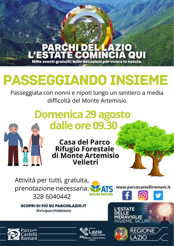 Domenica 29 agosto dalle 09.30 “Passeggiando insieme” - passeggiata con nonni e nipoti lungo un sentiero a media difficoltà del Monte Artemisio. Attività per tutti, gratuita, prenotazione necessaria: Ats Natura Matura - Stefania 328 6040442