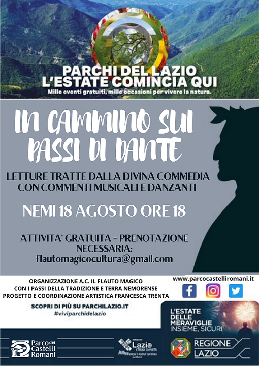 Mercoledì 18 agosto ore 18.00 "In cammino sui passi di Dante" - letture tratte dalla Divina Commedia con commenti musicali ritmici e danzanti. Nella scenografia naturale del piccolo borgo di Nemi, il visitatore sarà guidato in un cammino che, fra scorci pittoreschi, attraversa il centro storico fino alla terrazza sul lago. Commenti danzanti e ritmici si innestano sui passi della poesia di Dante. Con "I Passi della Tradizione e Terra Nemorense". Progetto e coordinazione artistica: Francesca Trenta, organizzazione A.C. Il Flauto Magico . Durata 1h circa, percorso facile nel centro storico sino al lago dai giardini pubblici. Attività per tutti, gratuita, prenotazione necessaria: flautomagicocultura@gmail.com